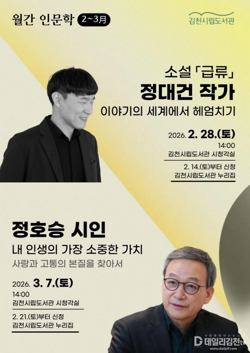 두 번째 강연은 3월 7일(토) 오후 2시, 한국 문단을 대표하는 정호승 시인이 함께한다. 오랜 시간 독자들의 공감을 받아온 정호승 시인의 시 세계를 바탕으로 삶의 근원적 가치와 사랑의 의미를 깊이 있게 성찰하는 시간을 통해 참여자들에게 따뜻한 울림을 선사할 것으로 기대된다.
