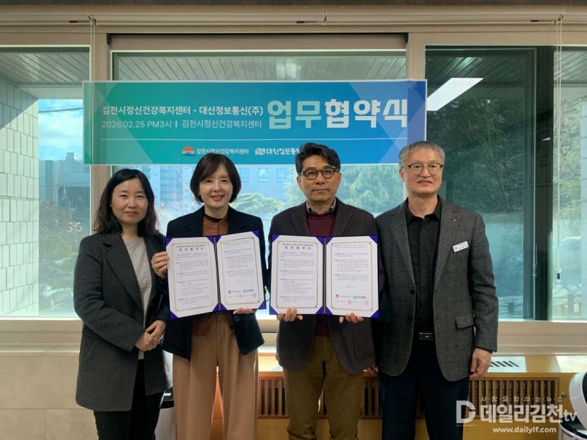 김천시정신건강복지센터와 대신정보통신(주)은 25일 근로자의 직무 스트레스 완화 및 정신건강 증진을 위한 업무협약을 체결했다.