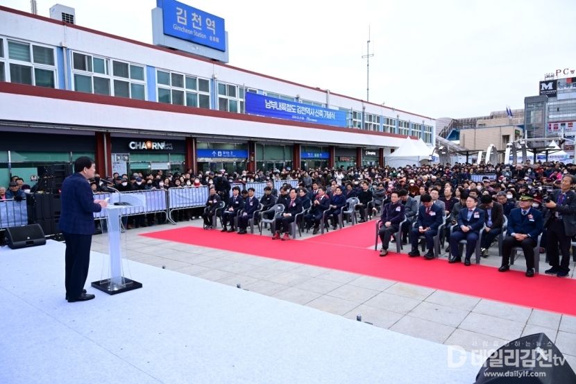 남부내륙철도 김천역사 신축 기념식이 27일 오후 3시 국가철도공단 주최로 김천역 광장에서 개최됐다.