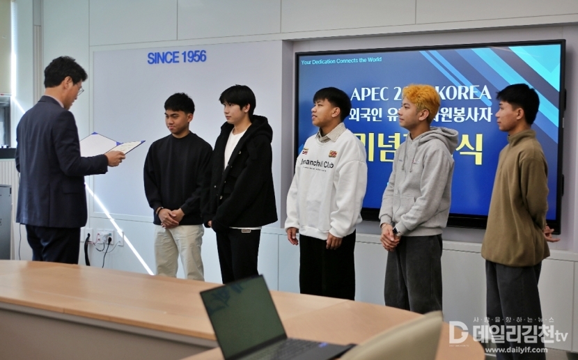 경북보건대학교(총장 이은직)는 지난해 APEC 행사 자원봉사자로 참여한 외국인 유학생들에게 지난 5일 동국대학교 WISE캠퍼스에서 전달한 자원봉사 확인서와 기념품을 수여했다.