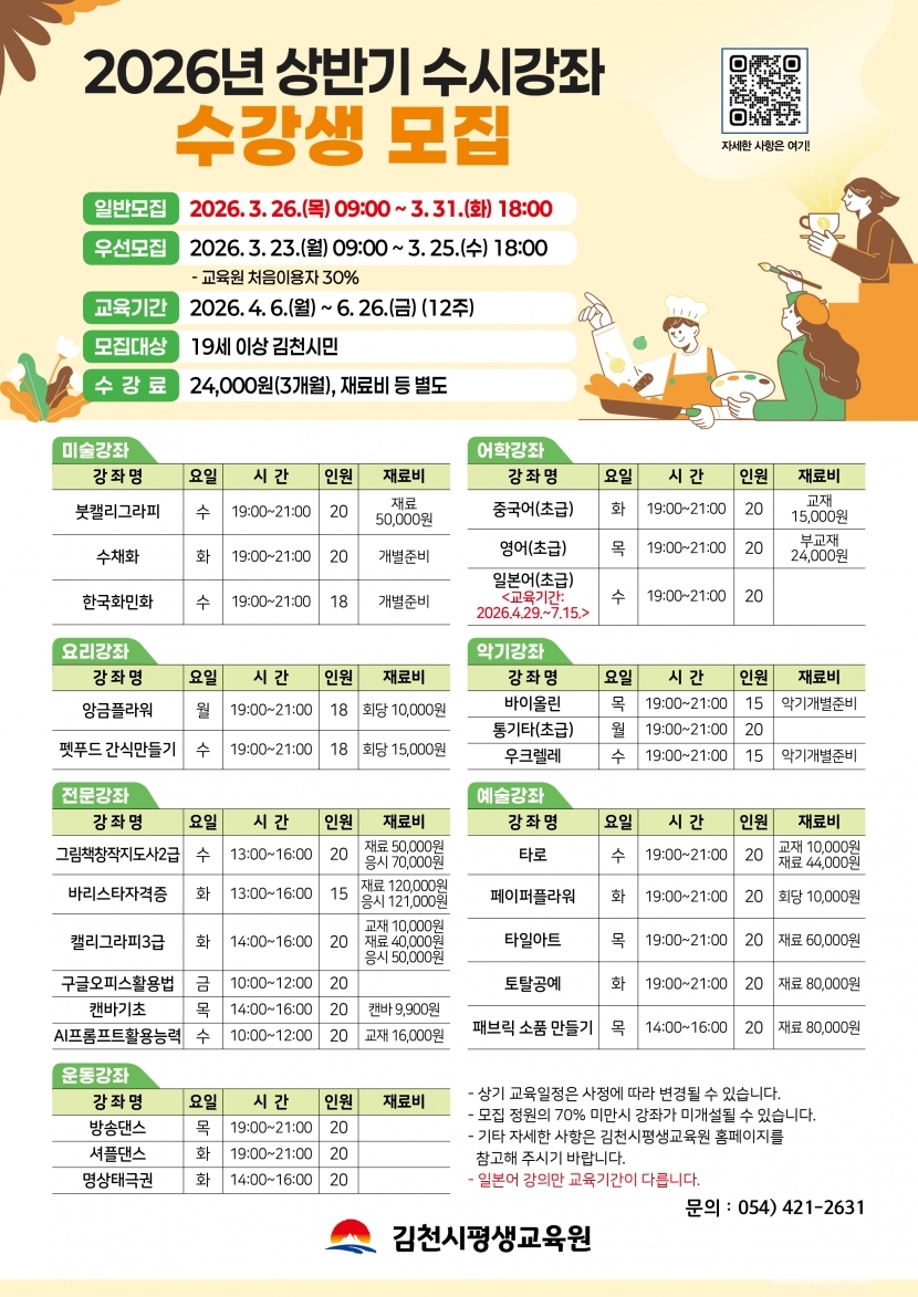 교육 기간은 4월 6일부터 6월 26일까지 3개월이며, 신청은 김천시평생교육원 누리집(www.gc.go.kr/welfare)에서 온라인으로 가능하다. 강좌별 상세 내용과 일정은 공식 누리집 공지사항에서 확인할 수 있다.