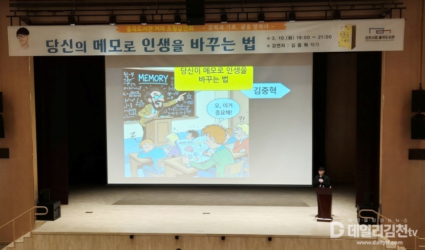 율곡도서관은 지난 10일 오후 7시 율곡홀에서 김천 출신 소설가 김중혁 작가를 초청해 ‘당신의 메모로 인생을 바꾸는 법’을 주제로 저자 초청 강연회를 개최했다.