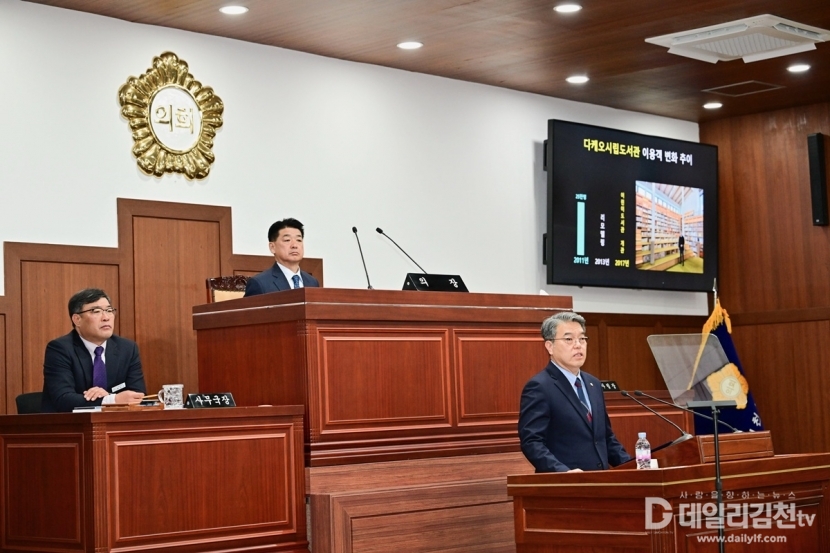 이 의원은 “목재 도서관은 단순한 건축사업이 아니라 김천의 자연과 정체성을 담는 도시 자산이 될 수 있다”며 “아이들이 머물고 시민들이 찾는 공간으로 조성해 김천의 미래를 설계하는 도서관이 되길 기대한다”고 말하며 5분발언을 마무리 했다.
