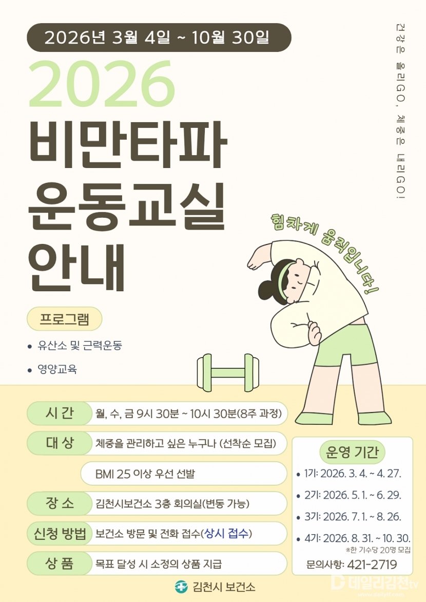이번 프로그램은 총 4기로 운영되며, 기수별 20명씩 선착순 모집한다. 수업은 3월 4일 1기를 시작으로 10월 30일 4기까지 진행되며, 보건소 3층 회의실에서 매주 월·수·금요일 오전 9시 30분부터 10시 30분까지 운영된다. 참가 신청은 김천시보건소 방문 또는 전화(054-421-2719)로 가능하다.