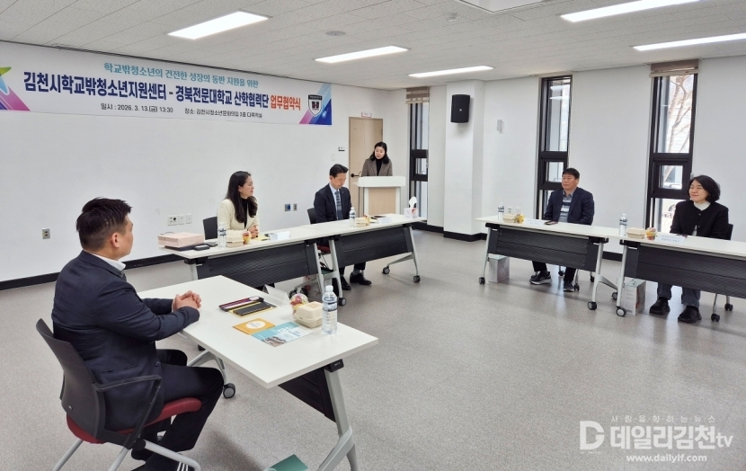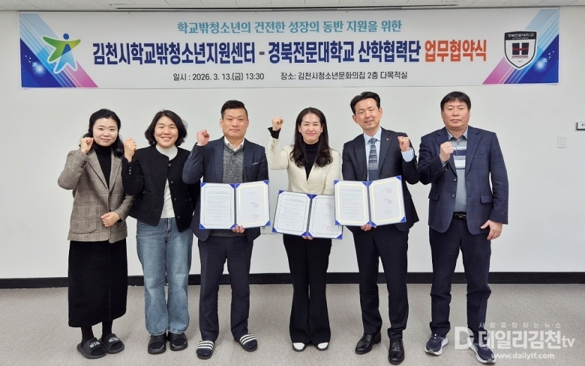 김천시학교밖청소년지원센터는 지난 13일 경북전문대학교 산학협력단과 학교 밖 청소년의 건강한 성장과 자립 지원을 위한 업무협약(MOU)을 체결했다.