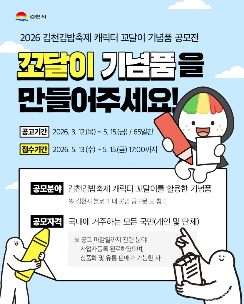 김천시는 김천김밥축제 캐릭터 ‘꼬달이’의 활성화와 창의적인 기념품 발굴을 위해 「2026 김천김밥축제 캐릭터 꼬달이 기념품 공모전」을 개최한다고 밝혔다.