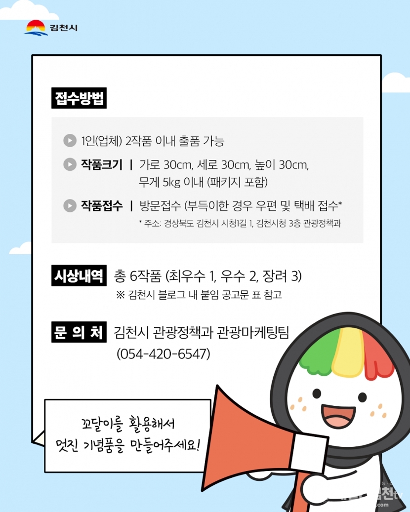 공모 기간은 3월 12일부터 5월 15일까지이며, 기념품 제작·납품 능력을 갖춘 대한민국 국민 누구나 참여할 수 있다. 공모 주제는 ‘김천김밥축제 캐릭터 꼬달이를 활용한 기념품’으로, 공모 분야는 ▲문구·사무용품 ▲생활소품 ▲패션잡화 ▲디지털·가전 ▲디자인 소품 ▲토이·취미 용품 총 6개 분야로 나누어진다.