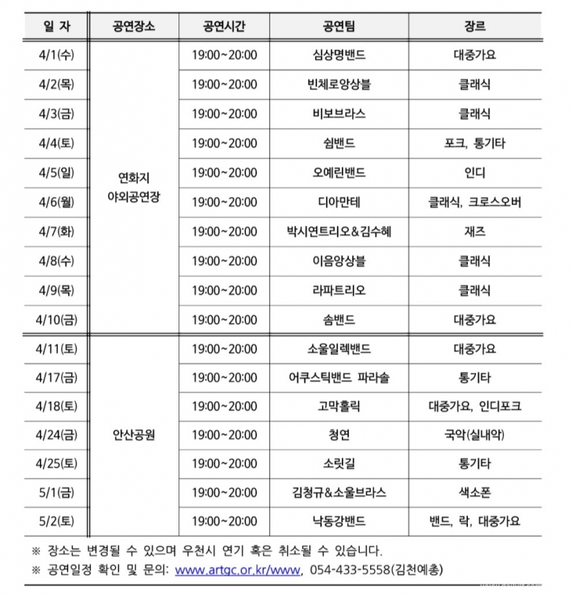 특히, 이번 공연은 장소와 기간을 나누어 진행해 시민들의 접근성을 높였다. 4월 1일부터 4월 10일까지는 2026 연화지 벚꽃 축제와 연계해 매일 오후 7시 연화지 야외공연장에서 진행된다. 이후 4월 11일부터 5 월 2일까지는 매주 금, 토요일 오후 7시 율곡동 안산공원에서 무대가 이어진다.