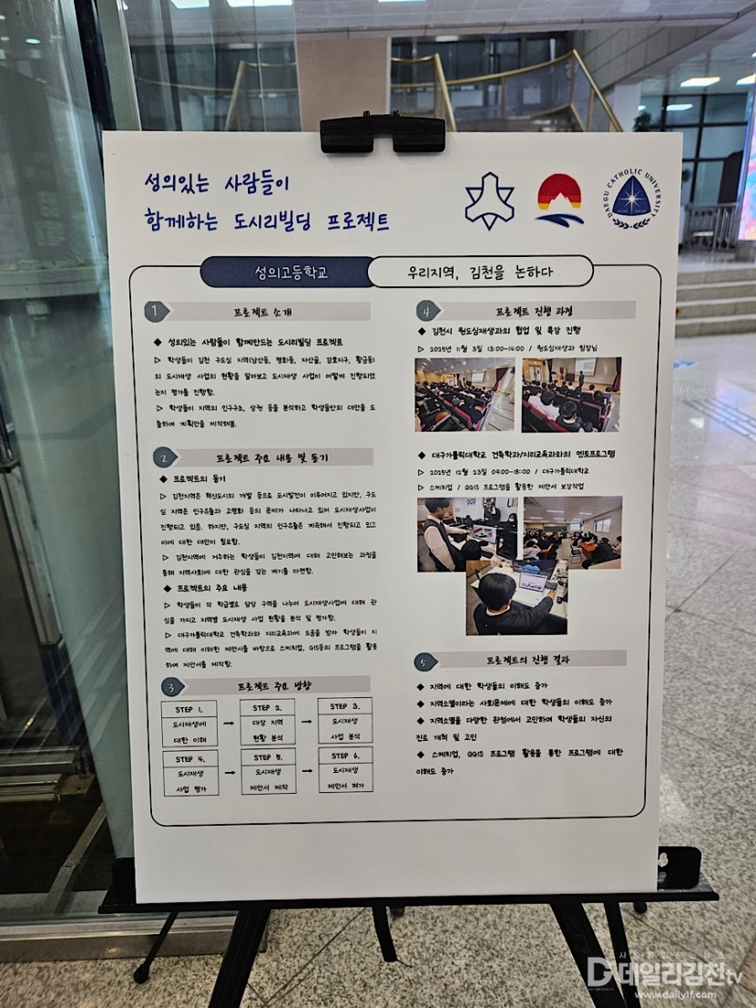 이번 프로젝트는 김천시 도시재생사업을 연구하고, 학생들이 직접 구상한 도시재생 아이디어를 결과물로 만들어 내는 지역 봉사 프로그램으로, 성의 고등학교 1학년 학생 112명이 20개 팀을 구성해 약 6개월 동안 참여했다.
