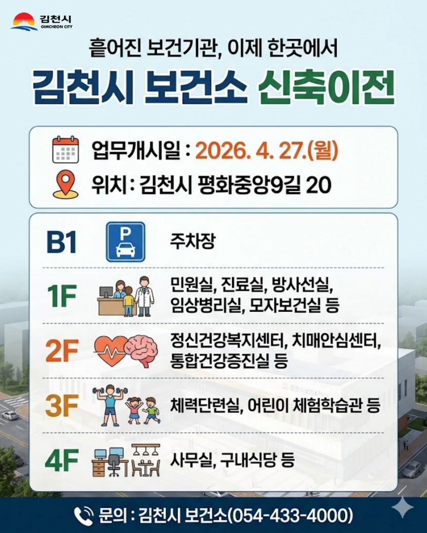 김천시는 시민 중심의 원스톱 보건의료서비스 제공을 위해 신축한 「김천시 보건소」를 오는 4월 27일 개소한다고 10일 밝혔다.