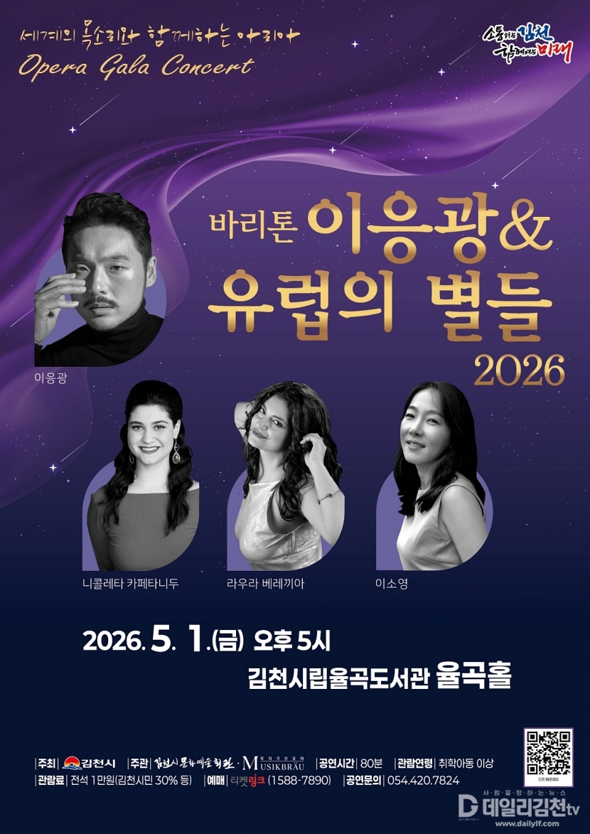 김천시 문화예술회관은 오는 5월 1일 오후 5시 율곡도서관 율곡홀에서 오페라 갈라 콘서트 <바리톤 이응광 & 유럽의 별들 2026>를 개최한다.