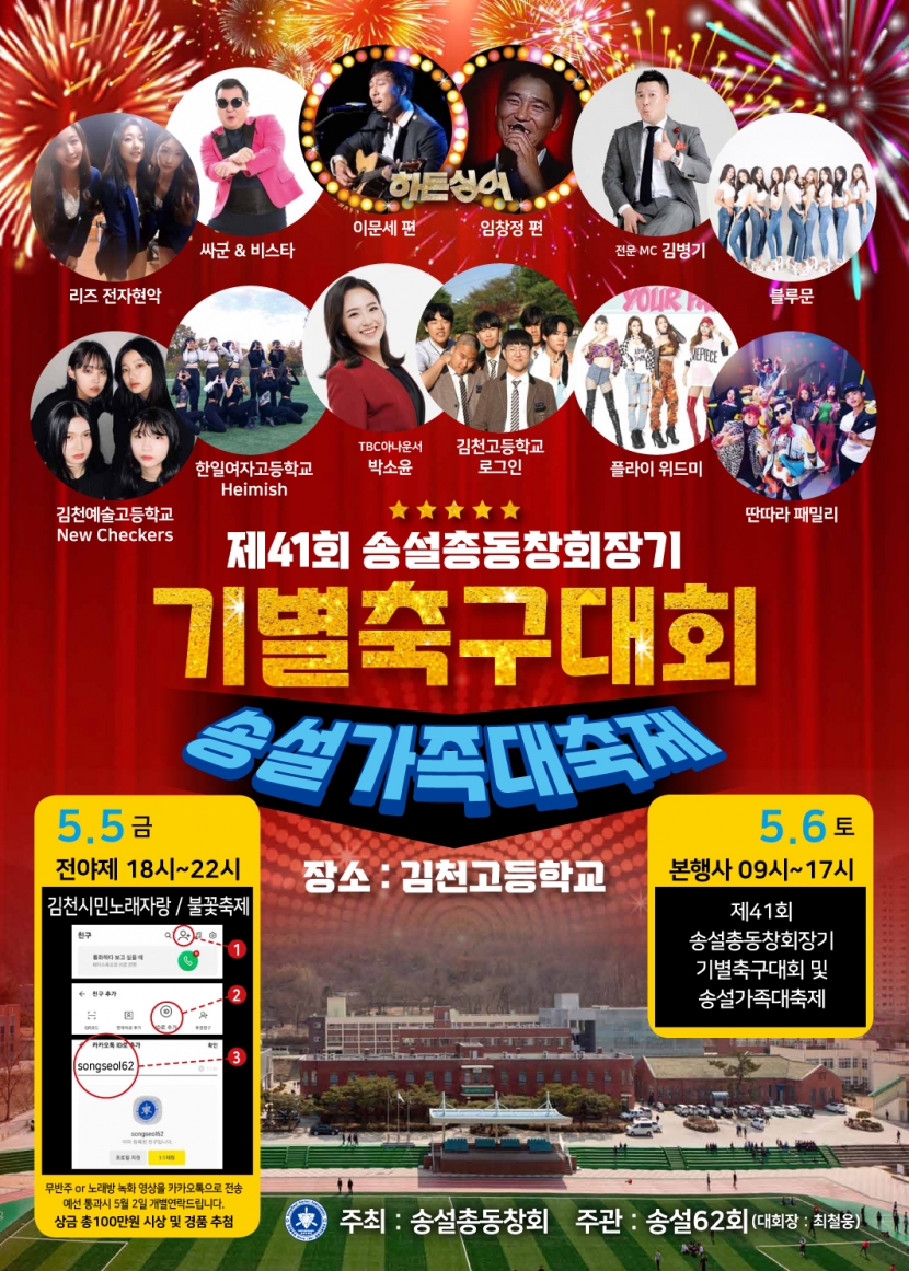 송설인이 하나되고 더 나아가 지역민과도 소통하는 대회로써 지역의 화합 축제로 승화할 제41회 송설총동창회장기 기별축구대회대회 및 송설가족대축제가 송설 62회 주최로 4년 만에 개최된다.