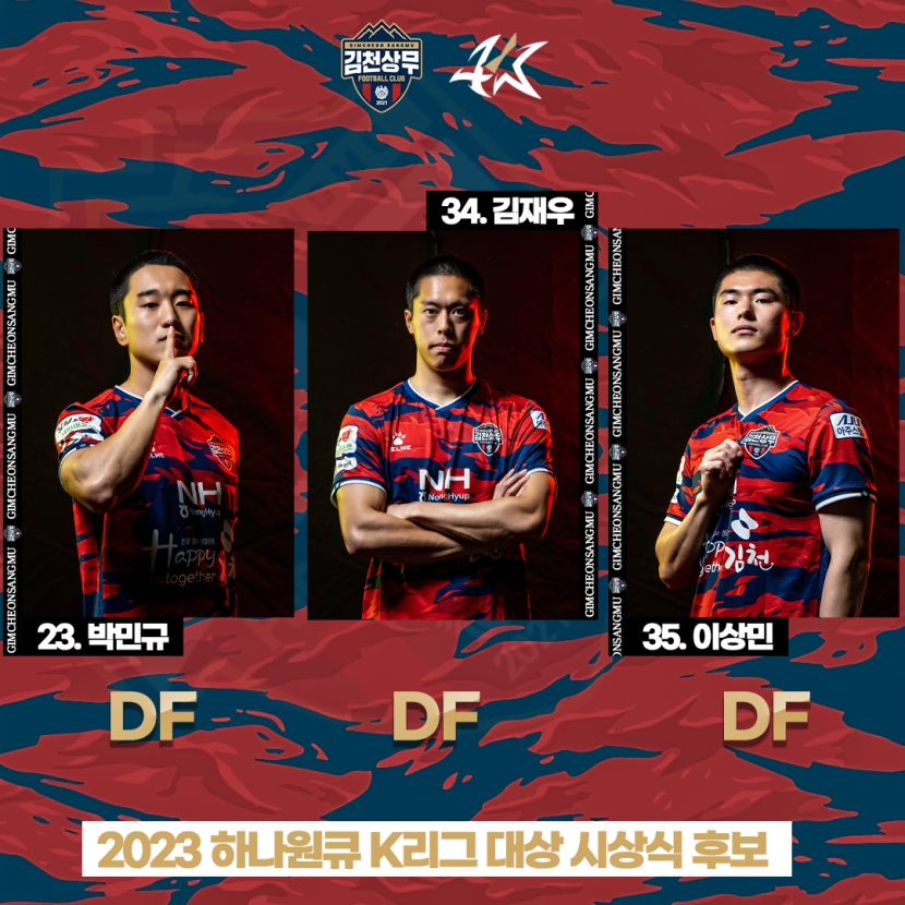 베스트11 골키퍼 부문에는 신송훈이 이름을 올렸다. 신송훈은 원 소속팀 광주FC에서 2021년 한 경기 출전이 전부였지만 입대 후 진가를 발휘했다. 2023 시즌 17경기에 출전하며 프로 데뷔 후 최다출전 기록을 세웠다. 수비수 부문에서는 박민규, 김재우, 이상민이 이름을 올렸다. 각각 김천에서 25경기, 33경기, 29경기를 소화했다. 특히 김재우와 이상민은 김천에서 K리그 통산 100경기를 달성하기도 했다.