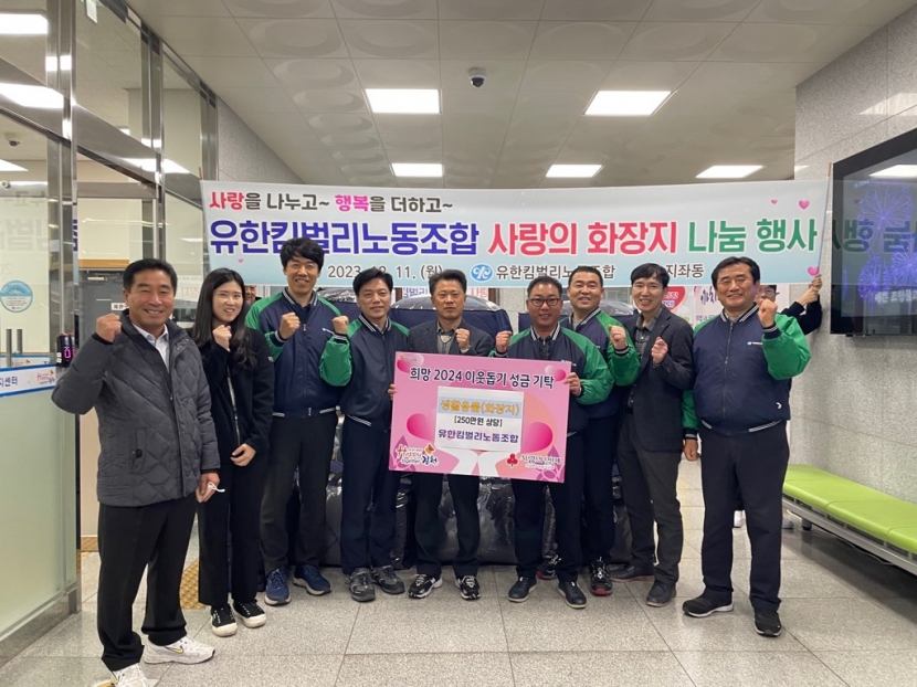 유한킴벌리노동조합(위원장 채용석)은 지난 11일 지좌동 행정복지센터(동장 남상연)를 방문하여 어려운 이웃을 위해 생활용품(총 250만 원 상당)을 전달해 지역사회에 온정을 베풀었다.