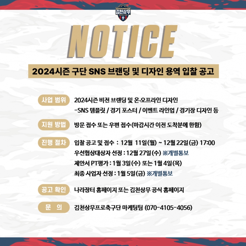 김천상무가 각 2024시즌 영상 콘텐츠 제작 용역 업체, 2024시즌 SNS 브랜딩 및 디자인 용역 업체 선정을 위한 공개 입찰을 진행한다.