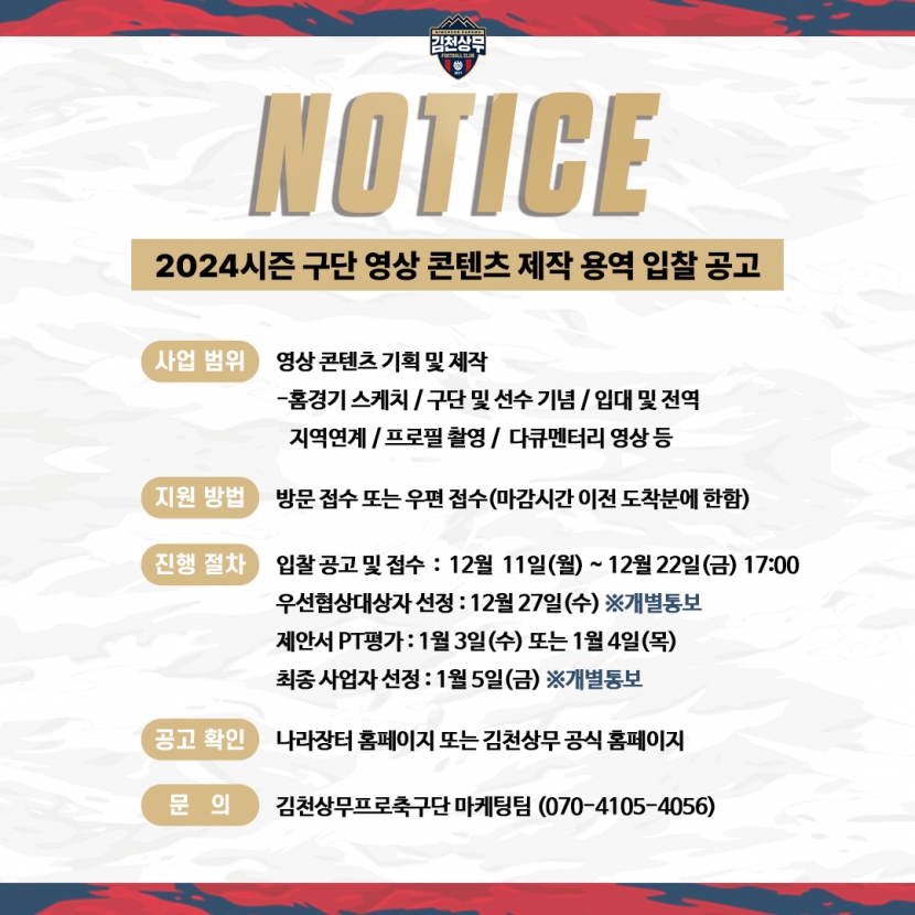 김천상무프로축구단이 12월 11일부터 22일 오후 5시까지 2024시즌을 함께할 각 영상 콘텐츠 제작 업체와 SNS 브랜딩 및 디자인 업체 공개 입찰을 실시한다.