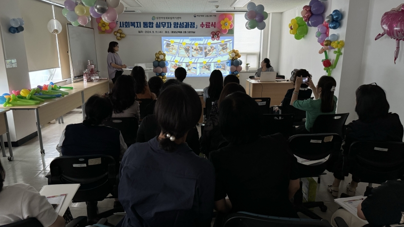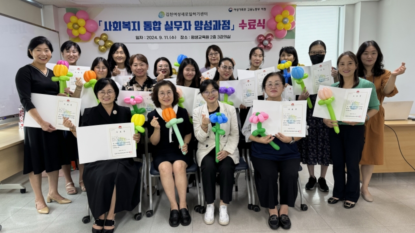 김천시평생교육원 여성새로일하기센터에서는 지난 11일 평생교육원 3강의실에서 국비 공모사업으로 추진한 직업교육훈련 『사회복지 통합 실무자 양성 과정』 수료식을 개최했다.
